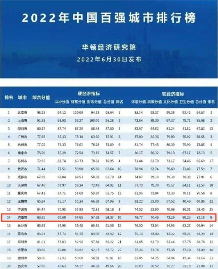 北京、上海、深圳、广州、杭州、南京、苏州、武汉、成都、天津高居前十位,重庆、无锡、宁波、济南、长沙、青岛、郑州、合肥、福州、西安居第十一至二十位。作为山东省会,济南此次以63.65总分上榜准一线城市,排名全国第14、山东第一。