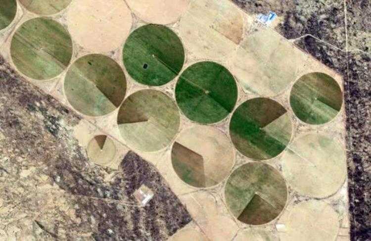 事实证明通过科学试验改良沙地确实可以收获,从卫星照片上我们可以看到原本是典型沙地的毛乌素沙漠的一部分正在变成一个又一个的泛绿的圆圈,从外形上看非常像欧洲的麦田怪圈,实际上这是种业公司的大型喷灌圈。