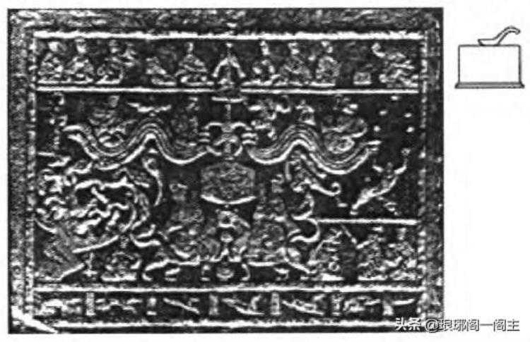 图1司南模型(王振铎复原)勺形司南尚无实物出土,但汉代画像石上,有类似勺形司南形象的画面(如图2所示),这表明王充的记载应该是可信的。在这幅石像中,可看到,画面主体是魔术师和杂技演员在表演,上面一行人是贵族观众,右上角的小方台上放着一个疑似司南的长柄匙(见画面外小插图),一个人在跪着观察它。