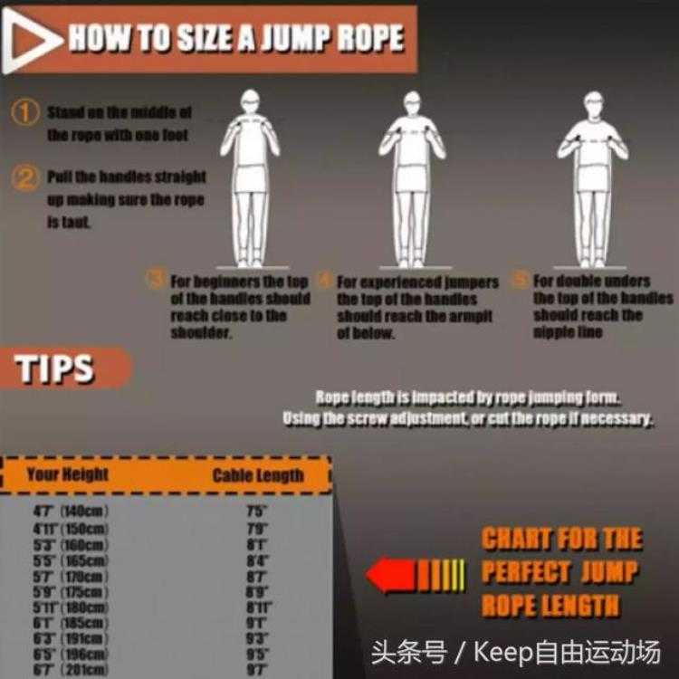 ► 长度:很多人会以为跳绳的长度无所谓,主要能用就行,其实并不然,我们购买了跳绳以后,一定要根据自己的身高进行修剪。过短就不用说了,容易绊倒,而过长的跳绳需要我们更高的跳跃与更大的挥动来完成跳绳动作,这会让你在想加速跳的时候难以到达你的最快速度,而且过大的挥摆会浪费掉很多不必要的体力,减少你的运动持续时间。