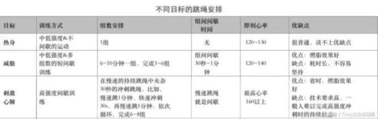 其实跳绳和跑步一样,都是一种运动形式,所以强度安排是要根据你自己的目标来设计的。太细的方案没法给,只能给大家一个表格作为参考: