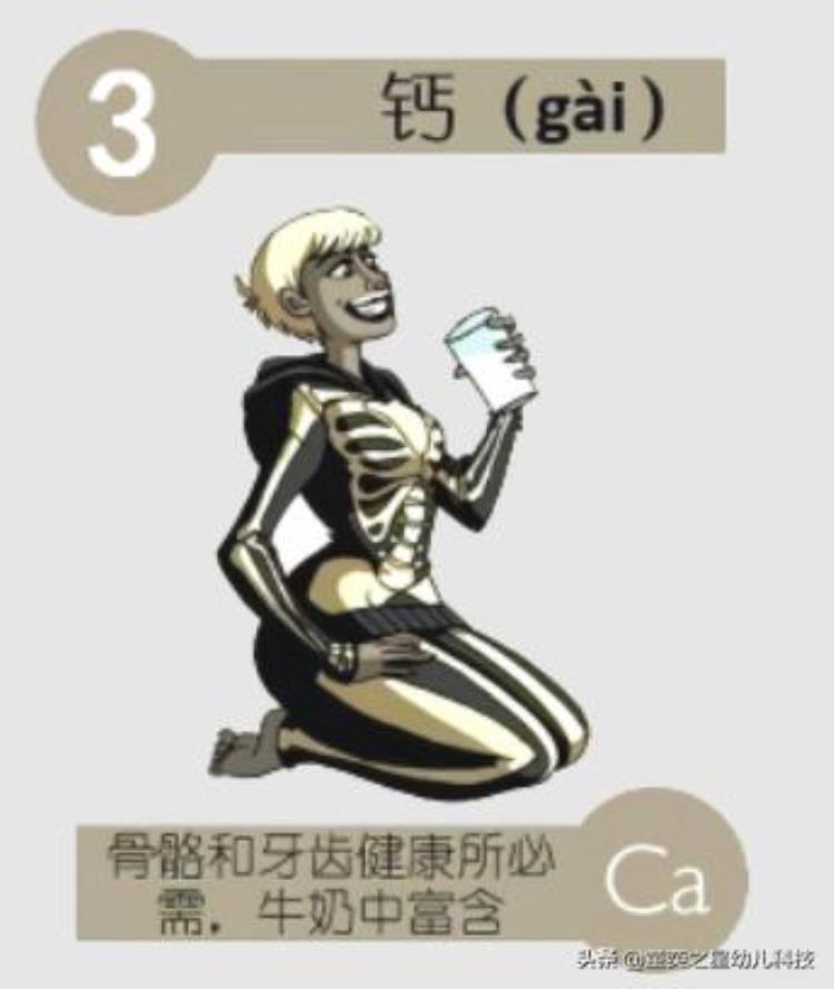 一 说 到 钙 , 你 最 先 想 到 的是钙片还是牛奶?其实,蛋壳儿、贝壳、海水中都含有钙。钙是地壳中含量最丰富的元素,也是人体中含量最多的金属元素。人体的钙含量约为1kg~1.25kg。这些钙99%以上都分布在骨骼和牙齿中,其余分布在体液及全身各组织器官中。