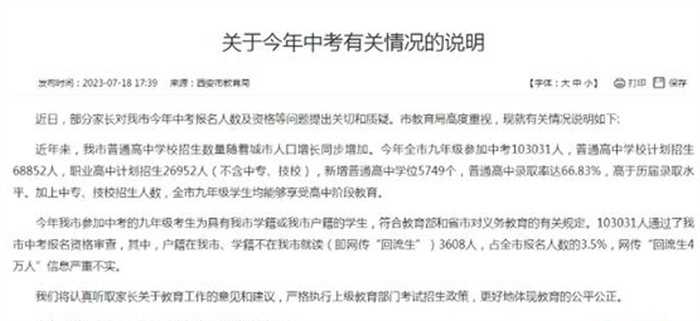 前些年西安地区凭借着人才招引计划,让越来越多的人落户在西安地区,而其中就有一部分户籍在外地的人口也落户在了西安,也就意味着他们的孩子是能够在西安地区参加中考和高考的,而参加中考并非是目的,而更加重要的是参加西安地区的高考,根据西安教育局通告显示,参加2023年中考的回流生大概有3608名,这个人数仅占全市参加中考人数的3.5%,这也就意味着并没有网络上面传播的1~4万人那么多。