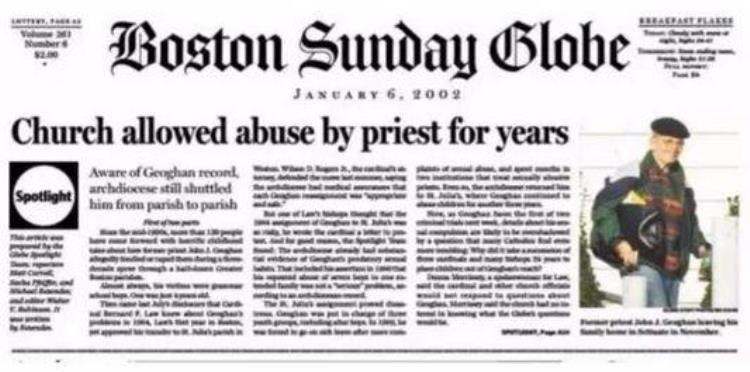 2002年《波士顿环球报》“聚焦”专栏曾揭露,当地教区不下60名神父对百余名儿童伸出黑手。这一事件也在美国轰动一时,并在2015年时被改编成电影《聚焦》(《SPOTLIGHT》)。