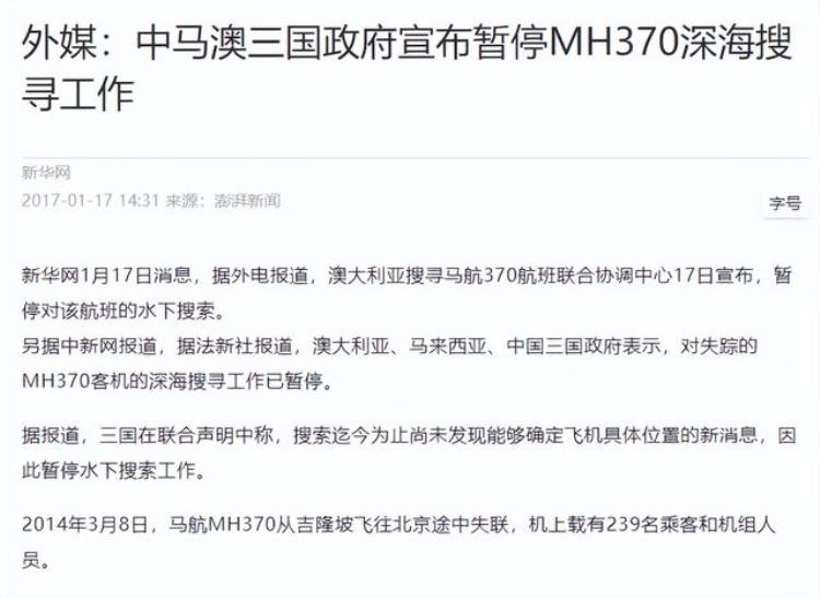 随后,中国相关部门立即启动了应急机制,寻找展开了搜救行动。不仅如此,马来西亚、越南、新加坡、泰国、美国、澳大利亚、英国、新西兰等国家,一共11个国家的船只和飞机参与到了马航MH370的搜救活动。各国对这场飞机事故极为重视,可是一直未能搜索到马航MH370。