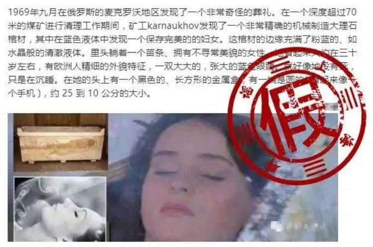 该“纪录片”称,在1969年“前苏联发现的一个煤矿中,沉睡着8亿年前的13岁少女”。然而,这段“纪录片”里全程没有给出少女的图像,甚至连发掘地点也没有提到。只是对出土这副棺材附近的村庄居民进行采访,而居民们的回答也大多模棱两可,只声称听说过有这回事。随后,网上就出现了《俄国科学家发现八亿年前美女女尸》的网传文章。