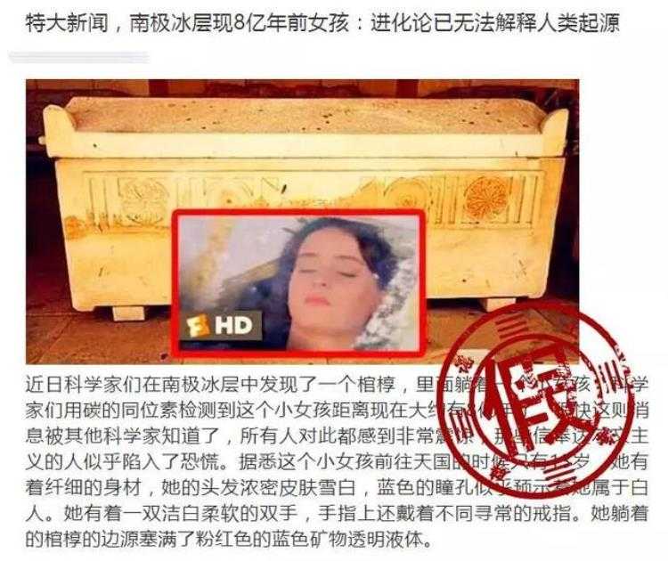 最近,一篇题为《特大新闻,南极冰层现8亿年前女孩》的文章在网上热传,引发不少网友关注。该文章称:“近期科学家们在南极发现了一个八亿年前的女孩尸体。小女孩被发现的时候躺在一个小的棺材里,经过对女孩的研究,从外表上看起来,女孩属于现在西方的白种人,还有着一双蓝眼睛,非常漂亮。”文章还发布了一张女孩图片。此事是真的吗?
