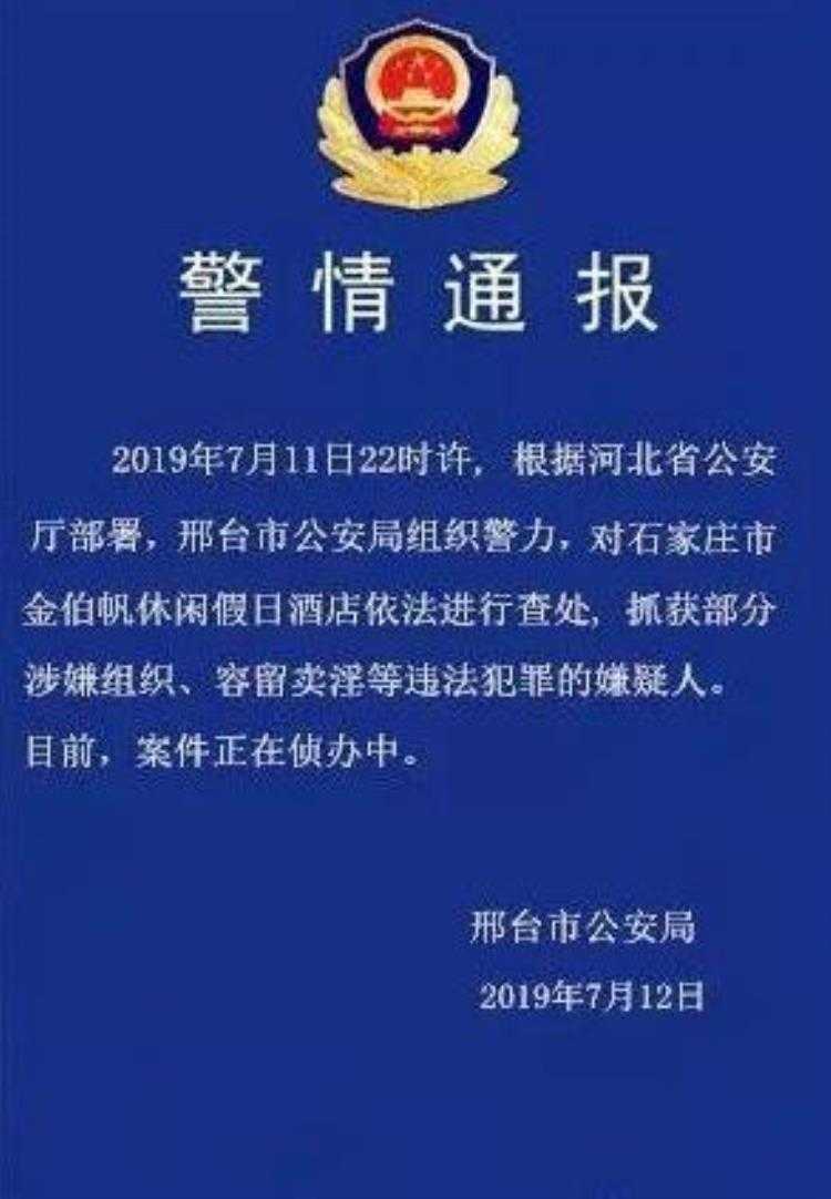 邢台市公安局通报,2019年7月11日22时,根据河北省公安厅部署,邢台市公安局组织警力,对石家庄市金伯帆休闲假日酒店依法进行查处,抓获部分涉嫌组织、容留卖淫等违法犯罪的嫌疑人。