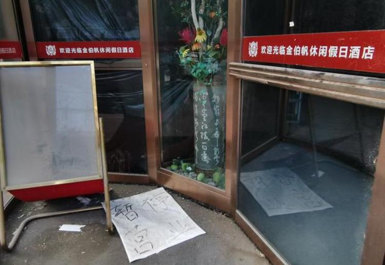 金伯帆酒店正门已落锁,门窗玻璃积有厚厚一层灰尘,门口地面一张纸上写有“暂停营业”。