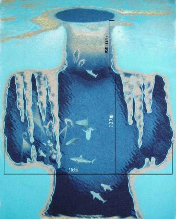 洪都拉斯蓝洞直径约0.4公里,深145米,洞里怪石嶙峋、鲨鱼环绕,不适合一般的潜水者探访,但却强烈吸引着全世界的潜水爱好者,它成为了全球最负盛名的潜水胜地之一。有“平生不潜此蓝洞,即称高手也枉然”之说。