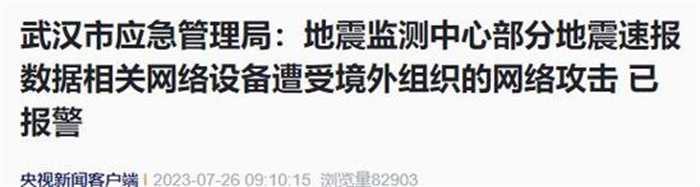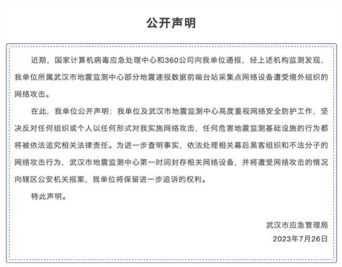 7月26日武汉市应急管理局发布声明称,该局所属武汉市地震监测中心,遭到为境外的组织网络上发起的攻击是2022年6月份西北工业大学遭到境外的网络攻击后又一次境外网络攻击案例。国家计算机病毒应急处理中心和360公司的专家组发现这一次网络攻击是境外有政府背景的黑客以及不法分子所实施发起的,初步证实对于武汉市地震监测中心网络攻击来自于美国。
