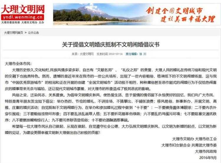 为了抵制“低俗闹婚”行为,2016年云南大理就曾发出过“十不要”倡议。