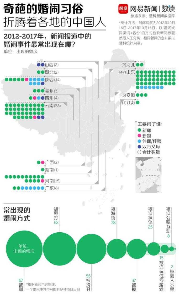 根据慧科新闻数据库的一份闹婚调查报告显示,2012-2017年我国婚闹现象最严重的省份在山东省、其次是云南、河南等地,闹婚对象最主要是新郎、其次是伴郎、伴娘以及新娘和双方的父母,采取闹婚的方式最多的是捆绑辱打和被扮丑,其次是被游街、被摸、被迫裸体,最少的是被迫玩低俗游戏、被迫公媳互动、被丢入水里等。