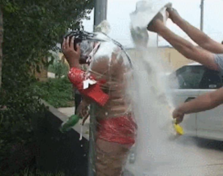 一众人把小涛的外衣外裤扒掉,用透明胶带捆在路牌杆子上,塞进去一件红色的女士内衣,开始往他身上浇啤酒。有人跑到附近的垃圾桶里翻出一袋过期面粉,捡回来撒在他身上。“整蛊”持续了大约20分钟。