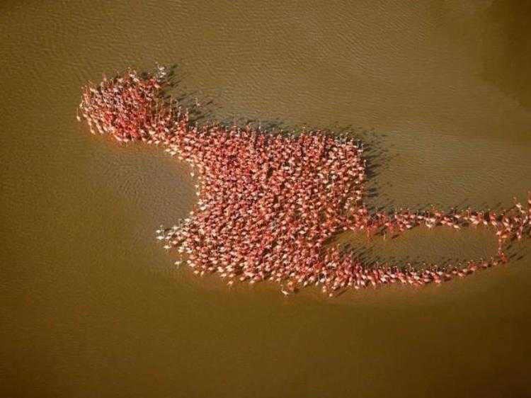 2010年,美国摄影师罗伯特·布拉德利·哈斯,在墨西哥尤卡坦坐飞机时,拍摄到了一只由几百只火烈鸟组成的“火烈鸟”…