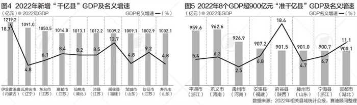 2022年千亿县经济总量在高速的增长49个县市增速比全国同期要高,10个县市的名义上增速超过了10%,福建,湖南,安徽,内蒙古等多个省上榜百强县的县域,GDP在1,000亿到2,000亿元数量的县域仅仅次于江苏和浙江,但1,000亿元以下进入排行榜的数量相对会少一些,这表明这些省头部县域在发展质量上是较高的,但整个区域当中发展有着较大的差距 山东、湖北以及四川1,000亿以下区间进入榜上的县域比较多,这三个省份有着巨大的发展潜力,后劲较为充足。