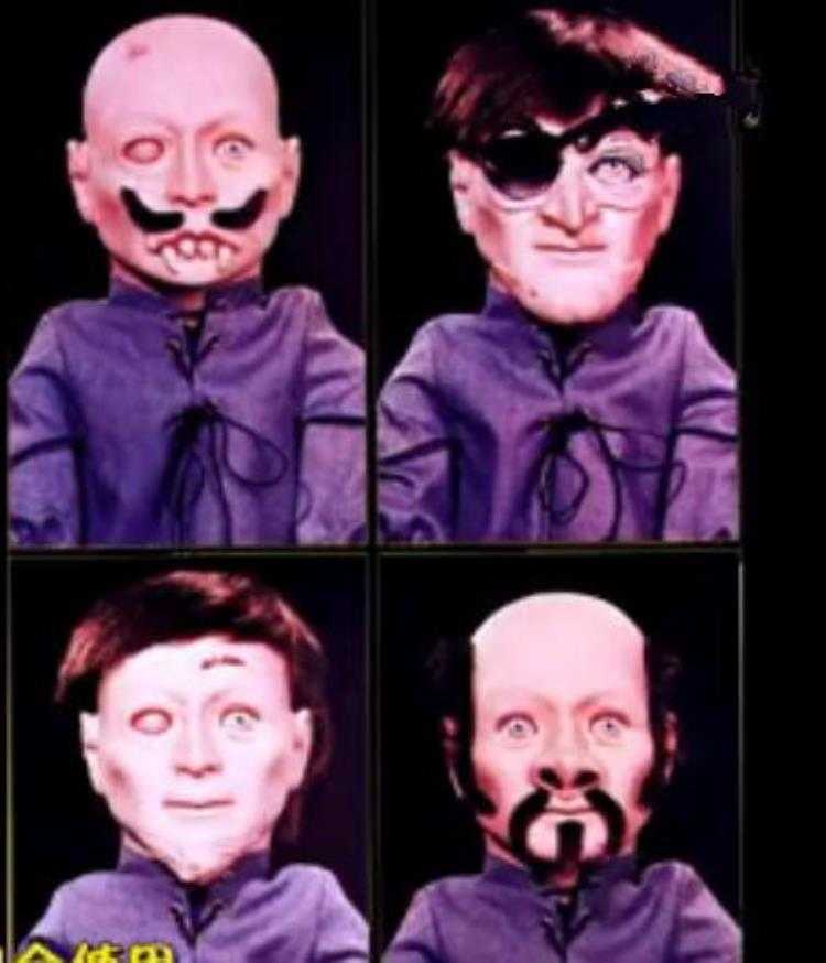 产于1975年雨果人偶是当时很受欢迎的儿童玩具,它有各种各样的配件,比如山羊胡子、假发、面具、鼻子、眼镜、眼罩等等。这些配件可以组装使用,给玩偶搭配出上百种不同的样貌,比如这样。刚上市的时候它是个非常有人气的玩偶,但时至今日它只在收藏界更受欢迎了。这个玩偶本身就很怪异,现在没有人气了也不奇怪,想想看谁会想要一个光秃秃的做出各种怪脸的家伙。