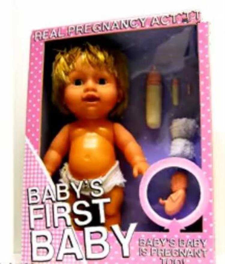 哦,我去,宝宝的第一个孩子是由艺术家达伦.科隆在2012年设计的一个玩具娃娃。为了引起社会评论,他希望提高人们对青少年怀孕问题的关注以及了解怀孕带来的问题,因此这个娃娃有妊辰纹,有备用尿布,有奶瓶,甚至还能破羊水。如果这还不够恐怖的话,它还有一个胎儿,而且胎儿也怀孕了。你完全能教会小孩安全的性行为,而不需要用这个玩具来给他们留下童年阴影对吧,简直是恶梦催化剂。