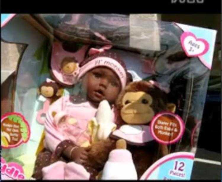 [抱抱我]娃娃是2009年发售的系列玩具,特点是一个宝宝周围环境围绕着各种动物,听起来好像没什么,不过有一个版本是一个美国黑人娃娃,旁边都是猴子,拿着一个香蕉放在她嘴边,她的帽子上还写着Lil Monkey,毫无疑问,没过多久这个娃娃就在各大商店下架了,因为有大量的家长投诉称这是种族歧视的玩具。虽然我不是一个主张政治正确性的人,但是这款产品的市场团队中应该有人预见这个问题才对,一个黑人娃娃嘴里有个香蕉,你真的没觉得哪里不对吗?