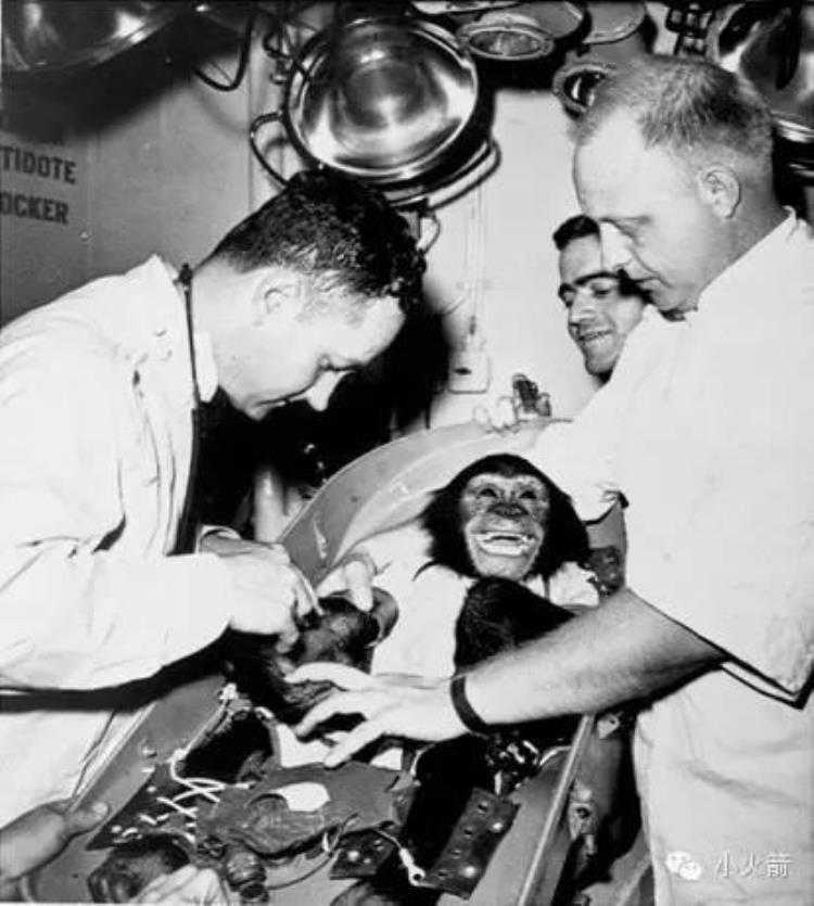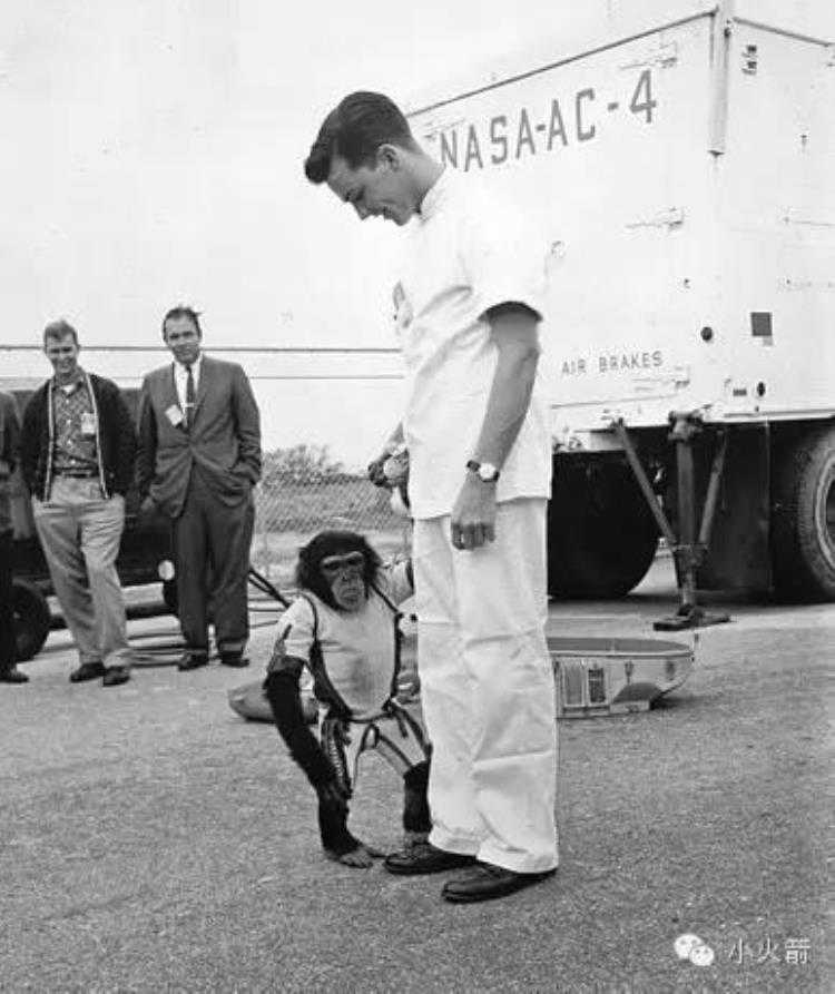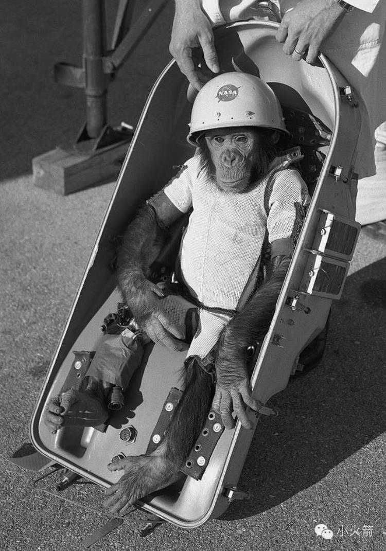 1961年1月31日黑猩猩哈姆穿上了飞行服坐在太空舱中,准备进入太空。这个时期的猴子和猩猩宇航员已经能够适应太空失重环境,并且能够通过飞船内的机械装置完成进食和一些简单的操作任务了。