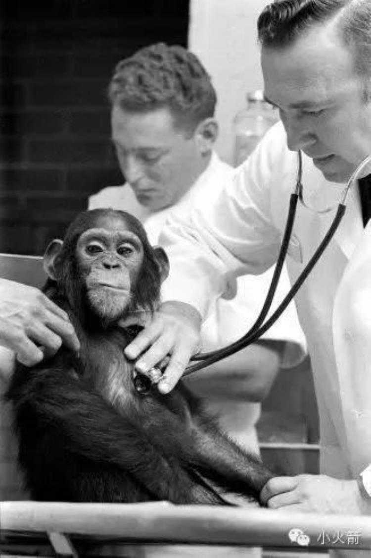 1961年1月底,喝了一罐牛奶,吃了半个鸡蛋和一些维生素片的哈姆正在接受检查。体重33斤半的黑猩猩哈姆将要成为一个传奇。