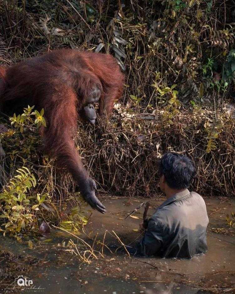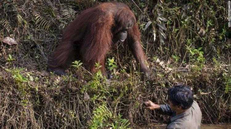 这是一位业余摄影师阿尼尔·普拉巴卡尔,在印尼婆罗洲猩猩生存基金会(BOS)的一个自然保护区里游览时拍摄的。当时基金会的一名工作人员接到报告,说那一带出现了蛇,于是便来到河里,准备把蛇清理出去。就在这时,一只婆罗洲红毛猩猩来到岸边,靠近了他,向他伸出了一只手。