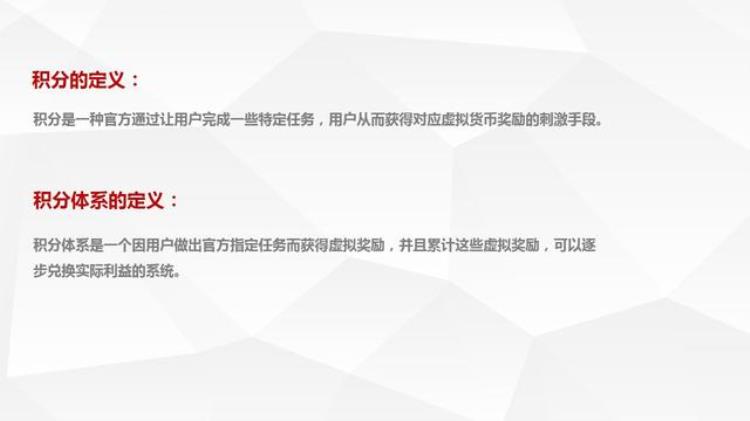 通过对这些积分体系的观察可以发现,所有的积分体系都是分为做任务获得积分以及累计积分兑换收益两部分的。所以我认为积分体系的定义是:积分体系是一个因用户做出官方指定任务而获得虚拟奖励,并且累计这些虚拟奖励,可以逐步兑换实际利益的系统。