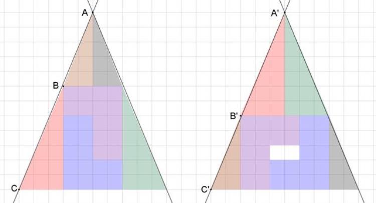 虽然看起来所有发生的事情都是一个大三角形的碎片的重新排列,然而棕色三角形、红色三角形和看起来像是大三角形的东西都有不同的斜率。