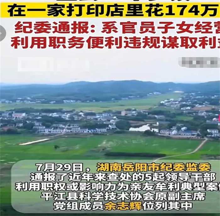 7月29日,湖南岳阳市纪委监委在微信公众号上通报了近年来查处的5起领导干部利用职权或影响力为亲友牟利典型案例,通报余志辉利用职务便利违规为子女经营活动谋取利益的问题”