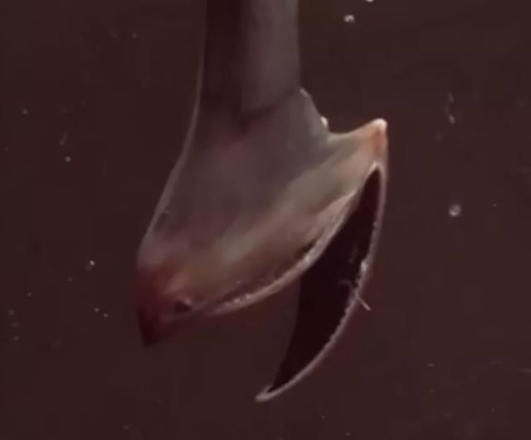 因此,吞噬鳗平时只会直直地立在深水中,有东西靠近就把下颌骨张开,水流产生的吸力就会把猎物吸进去。