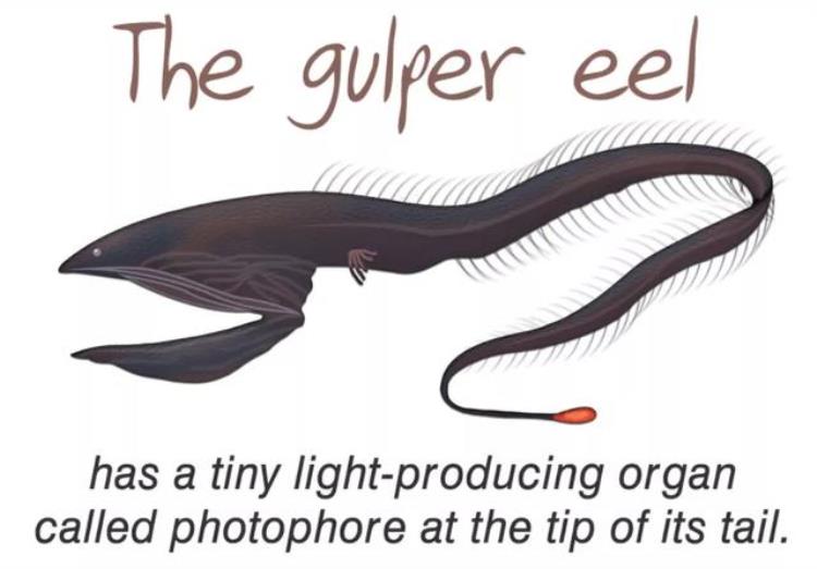 说出来你可能不信,吞噬鳗长了个血盆大口,却主要小生物为食,比如浮游性甲壳类生物。偶尔运气好,也能吃到小鱼或一些无脊椎动物。
