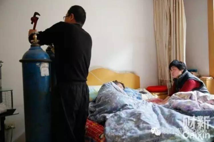▲4月11日,陕西咸阳。魏则西肺部功能衰竭严重,只能利用氧气瓶维持生命。他的父亲魏海全在为儿子更换氧气瓶,母亲坐在床边陪伴。图片来源:财新网