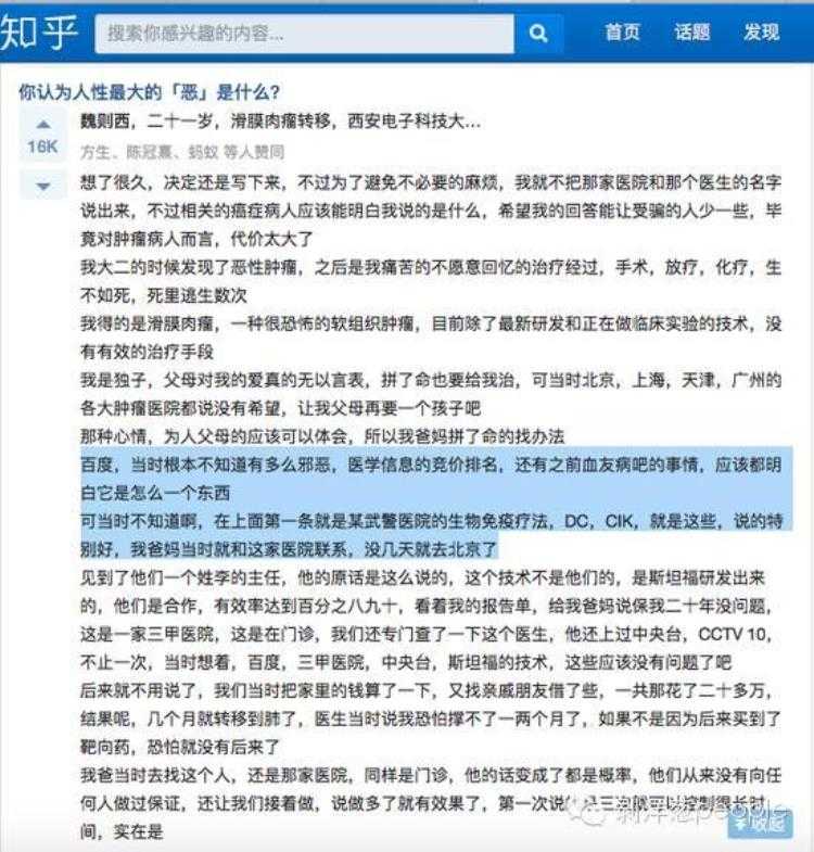 知乎上有人提问:“你认为人性最大的‘恶’是什么?”魏则西将这根“救命稻草”的故事作为回答。医院,是在百度上搜的,排名领先。疗法“说得特别好”。他在文中还提到,当时武警北京二院的医生曾经对他说该院与国外大学合作,“有效率达到百分之八九十,看着我的报告单,给我爸妈说保我20年没问题”。结果却被网友告知生物免疫疗法是被国外临床淘汰的技术。
