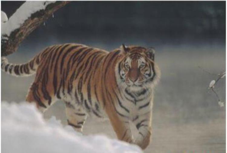 西伯利亚虎身体厚实,被毛为黄色,随着季节变化毛色的深浅也会发生改变,冬季毛色淡黄,夏季棕黄色,体表除腹部以外横列着众多黑色条纹,额头上的黑色横纹中间常被串通,看上去像一个 “王”字,十分威风,故有 “万兽之王”的美称。