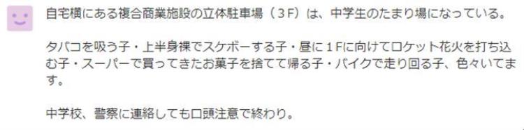 还有网友表示,自己也遇到过类似的事情,自宅旁边商场的停车场是当地不良中学生的聚集地,“在白天有人向商场大楼发射烟花,此外,还看见有人吸烟,有人驾驶摩托车等等,但即使联络中学和警察,他们也只受到了口头警告。”