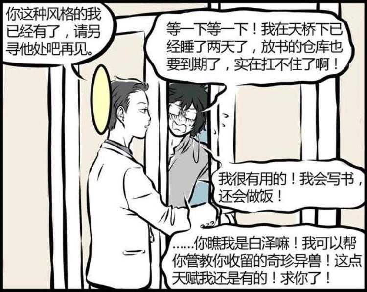 来到观音大士家门口,白泽特意恢复真身,让观音大士知道自己是谁,可是观音大士对白泽的出现并不惊讶,并且还不怎么待见白泽,因为白泽这种风格的异兽,观音大士已经有了。白泽可怜兮兮地看着观音大士,并让观音大士收留自己,毕竟自己已经没有地方可去了,自己住在天桥底下,然后放书的仓库也到期了,所以他实在熬不住了。白泽自己还可以烧饭,写书,用处不小呢,当然这只是白泽对自己的推销,最后说出了重点,白泽身为神兽,可以帮观音大士管理奇珍异兽。