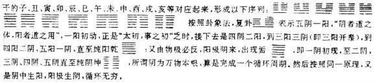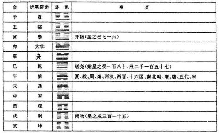 “太极既分,两仪立矣。阳下交于阴,阴上交于阳,四象生矣。阳交于阴,阴交于阳,而生天之四象;刚交于柔,柔交于刚,而生地之四象,于是八卦成矣。八卦相错,然后万物生。是故一分为二,二分为四,四分为八,八分为十六,十六分为三十二、三十二分为六十四。故曰分阴分阳,迭用刚柔,易六位而成章矣。”六十四卦可以概括万物的象,最后一卦是“未济”,意味着下一轮循环又从头开始,这样一来,恰恰同佛教轮回说殊途而同归。邵雍从六十四卦中挑出复、临、泰、大壮、夬、乾、姤、遁、否、观、剥、坤,分别同十二天干的子、丑、寅、卯、辰、巳、午、未、申、酉、戌、亥等对应起来,形成以下序列: