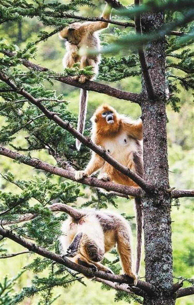 金丝猴在神农架国家公园大龙潭金丝猴野外研究基地活动。 新华社记者 肖艺九摄