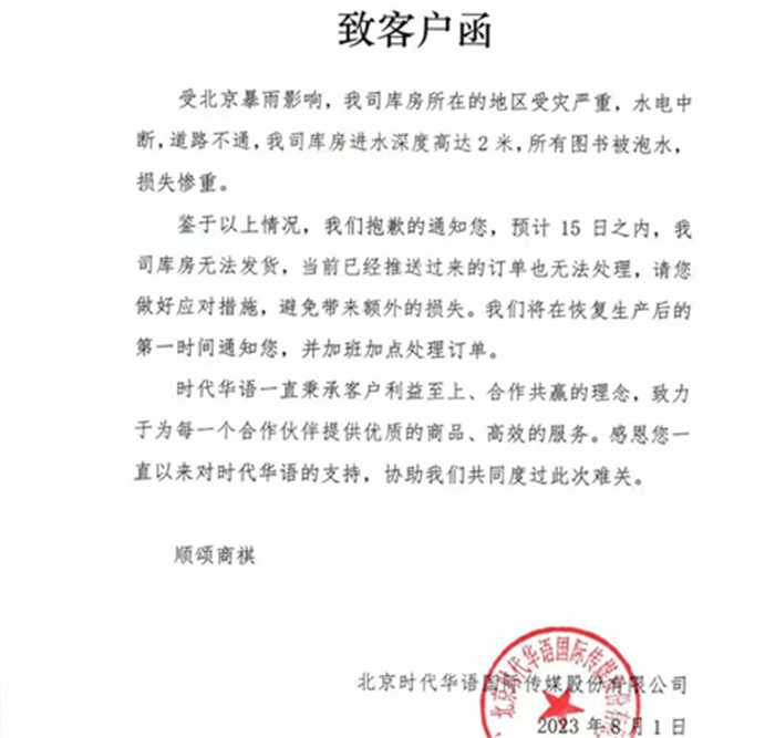 根据了解在涿州西南物流仓库东区的北京时代华语库房受到了极为严重的灾害,水电中断,道路不通,一共进水的深度达到了两米,所有图书都被水所泡过,有着极为严重的损失,科学普及出版社也被全部淹没,因为水过于深仍无法前往,所造成的损失难以估量。