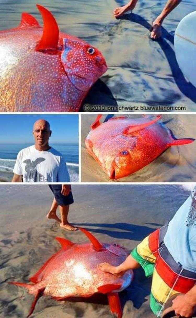 这是海滩上出现的一种美丽的红色鱼,它有点儿像月鱼,但又不完全像,有人称它为翻车鱼,人们很少能观看到这种深海鱼类,即使生物学家和钓鱼者一直在寻找它们。