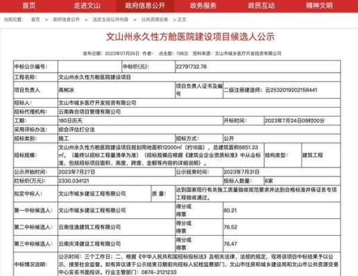 云南文山市政府官网在不久前发布一份永久性方舱医院建设项目引发了争议。该项目公示当中明显写到文山川永久性,方舱医院建设项目,总用地面积是12000平方米,大约18亩地左右的大小,总建筑面积达到了6651.33㎡,永久性方舱医院建设项目工程拦标价是2300万元,工程的工期是180天,该工程投标人的数量一共有8家,永久性方舱医院建设项目拟定中标单位是文山市城乡建设工程有限公司。