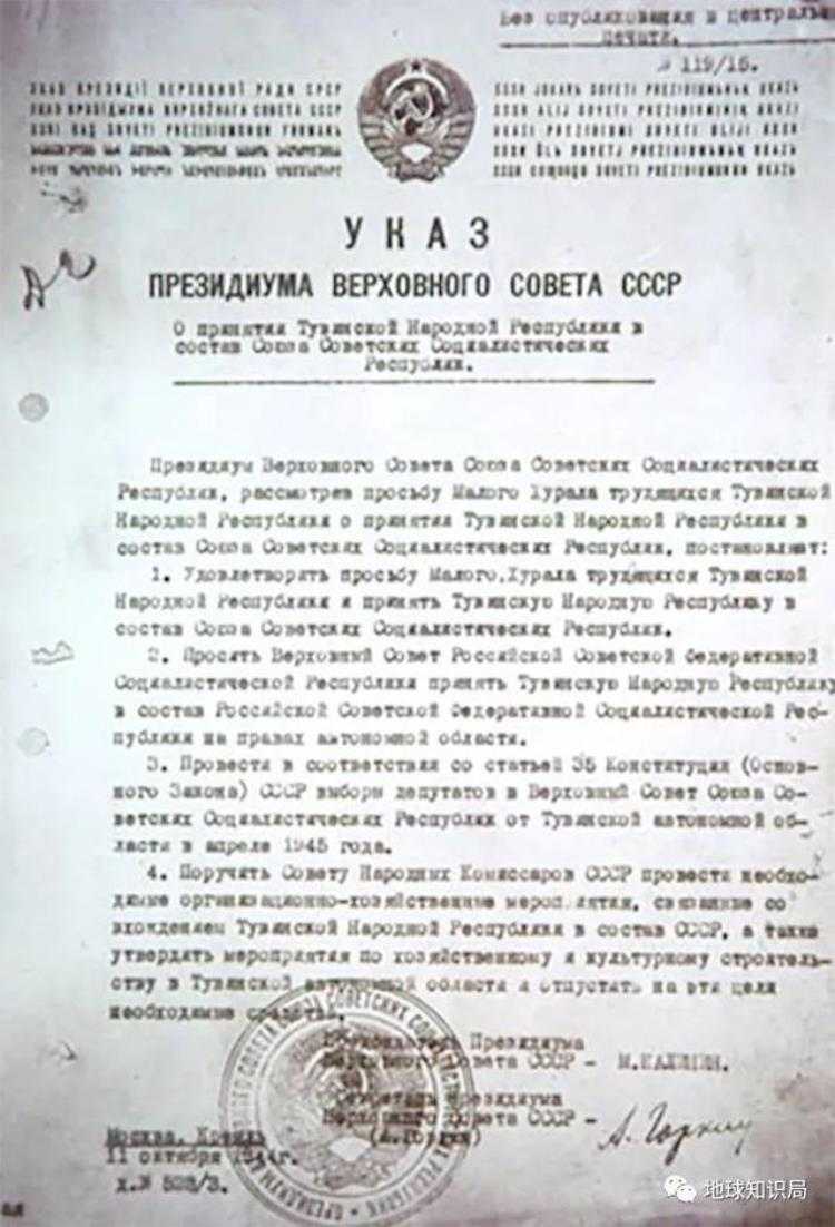 1944年,图瓦共和国“申请”加入苏联,成为苏联的一个自治州,唐努乌梁海从此正式成为苏联领土。