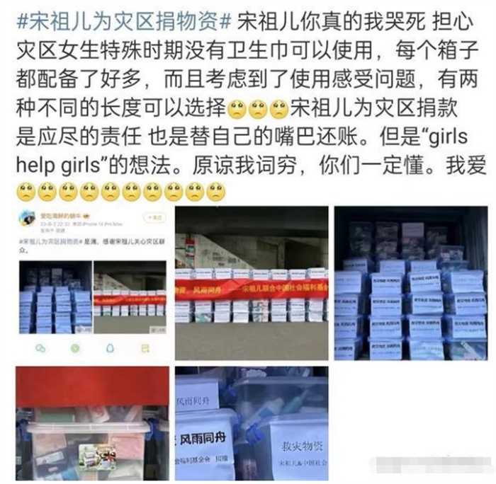 宋祖儿前几天因言行不当引起争议,随后她发文道歉,并为灾区捐物资,包括卫生巾、纸巾等日常必备用品。