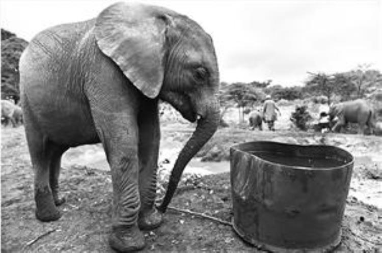 2015年8月6日,在肯尼亚内罗毕市郊的“大象孤儿院”,一头小象准备喝水。