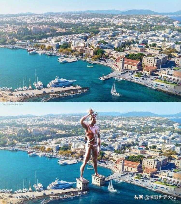 罗德岛巨像这是一座位于希腊罗德市港口的入口处的巨像,所有进入港口的船只都在巨像的腿间通过,十分震撼。它是希腊太阳神赫利俄斯的青铜铸像,高约33米,建于约公元前292年至280年,历时12年。