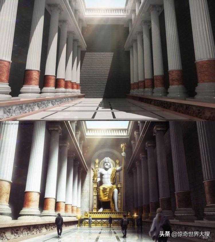 宙斯神像大致建于公元前457年,位于希腊奥林匹克宙斯神殿内。这尊坐像高达12米,占据了侧廊一半的空间,是当时世上最大的室内雕像,后来在公元5世纪失踪。