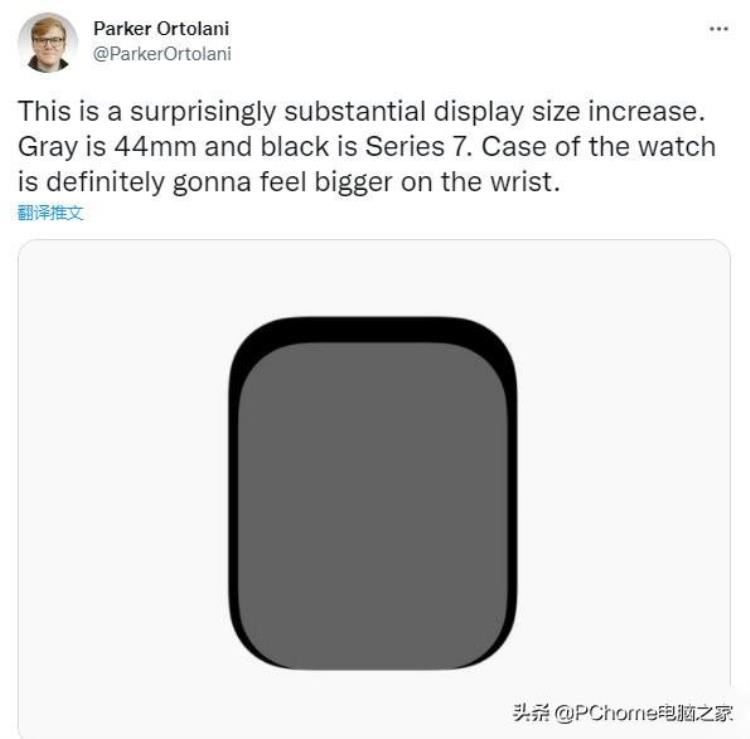 @Parker Ortolani表示全新的Apple Watch Series 7将会采用更大的表盘,最大表盘尺寸从44mm提升至45mm,带来的屏幕大小提升也就是从1.78英寸提升至1.9英寸,更大的屏幕有助于提供更好的阅读、操作体验。根据@Parker Ortolani爆料的图片来看,图中灰色地方是目前Series 6的表盘尺寸,而黑色部分则是Series 7的表盘尺寸,相对来说更加的修长而宽度改变较小,猜测表带也是可以与前代通用的。