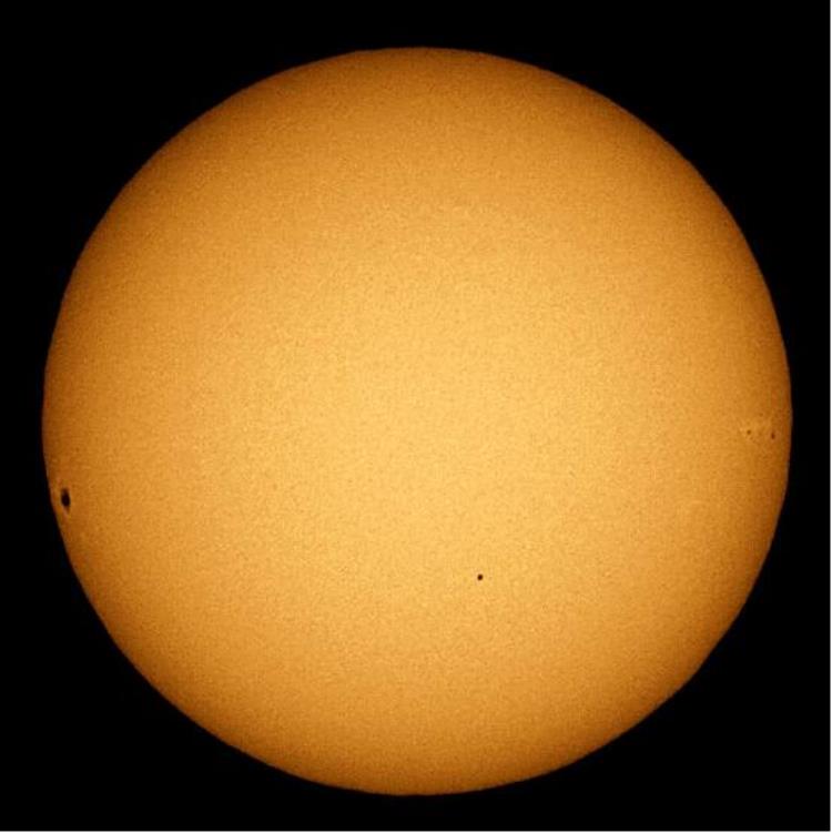 2006年11月8日发生的水星凌日。画面中部偏下的小黑点是水星,左边较大的一个黑点和右边的两个黑点是太阳黑子。