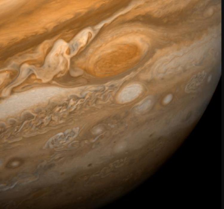 这是航海家1号太空船于1979年2月25日距离木星920万千米飞掠过木星时拍摄的影像。大红班下方白色的椭圆正是直径大约与地球相同的风暴