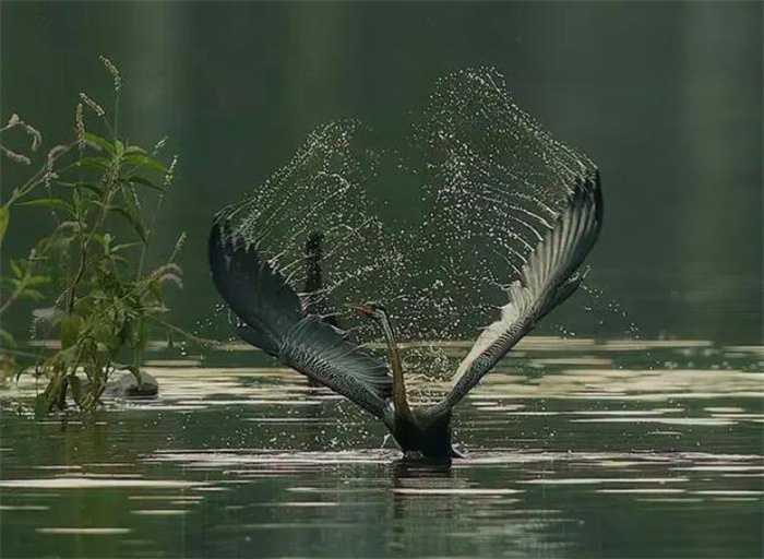 而根本上来说,“蛇鸟”其实并非蛇,是一种鸟,学名黑腹蛇鹈。外形来说,最显著的特征就是上文提到的它的脖子。此外,除了脖子,它的喙、尾巴也很长,翅膀展开也非常大。作为一种水鸟,它不仅会将鱼类当场吞下,有时候还会掠过湖面时用嘴把鱼叉住,接着甩到天空吞下。